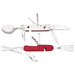 Features fork, spoon, honed blade, serrated blade, saw blade, sturdy reamer, file, bottle opener, scissors, corkscrew, and hook. When both spoon and fork are open tool splits in two for easier eating. Measures 4-3/4.closed, 7-1/2.open. Limited lifetime warranty. Gift boxed.