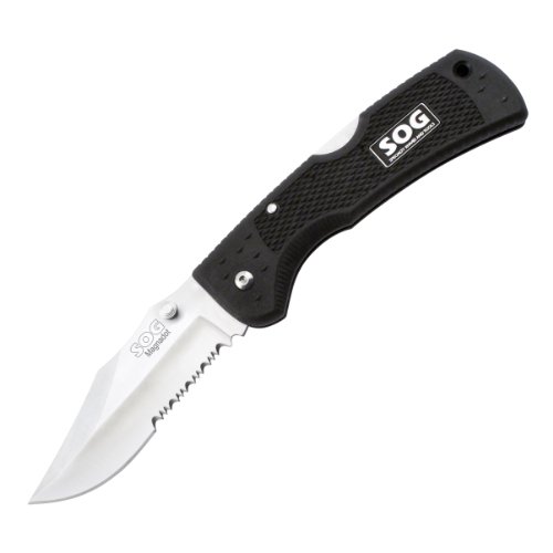 The Magnadot is a meaty folder. It has substance and you know it when it is in your hand. A traditional and reliable pattern that will give years of reliable use, the Magnadot is more turtle than hare. Easily opening the formidable half serrated blade with one hand gives you a sense of power. Magnadot... it is happening big. Blade Length 3.63" x .154" Overall Length 8.4" Weight 4.4 oz. Edge Half Serrated Steel 7Cr17MoV HRC 55-57 Handle GRN Finish Satin Includes Nylon Pouch Country of Origin Chinayou looking for inexpensive SOG Specialty Knives & Tools S301N-CP Magnadot 2.0 3.63-Inch Half Serrated Folding Knife with GRN Handle, Satin?